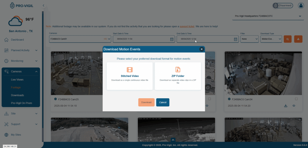 - Motion Events Now Have Flexible Dowload Options: In addition to enhancing our continuous footage download options, we have also streamlined how you can get your motion event footage. You can now choose a stitched video for easy viewing of all the events or choose to download each of the separate clips in a ZIP folder.