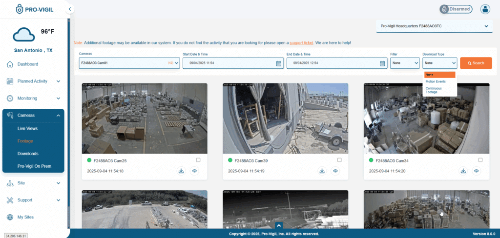 - Streamlined Continuous Footage Downloads: This new feature significantly improves usability, giving you the ability to quickly dial in the start and end time of the footage you want to download. Simply go to the Cameras menu on the main navigation and select the Footage option to begin now!